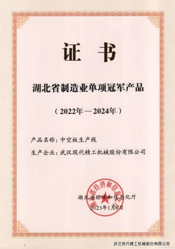 近日,在湖北省經(jīng)濟(jì)和信息化廳公示的2022年湖北省制造業(yè)單項冠軍企業(yè)(產(chǎn)品)名單里,武漢現(xiàn)代精工機(jī)械股份有限公司榜上有名,公司的中空板生產(chǎn)線通過了復(fù)核考驗,繼續(xù)享有湖北省制造業(yè)單項冠軍產(chǎn)品的稱號。