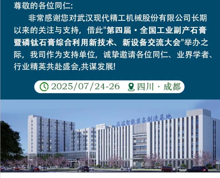 現(xiàn)代精工誠(chéng)邀您共赴第四屆全國(guó)工業(yè)副產(chǎn)石膏暨磷鈦石膏綜合利用新技術(shù)、新設(shè)備交流大會(huì)